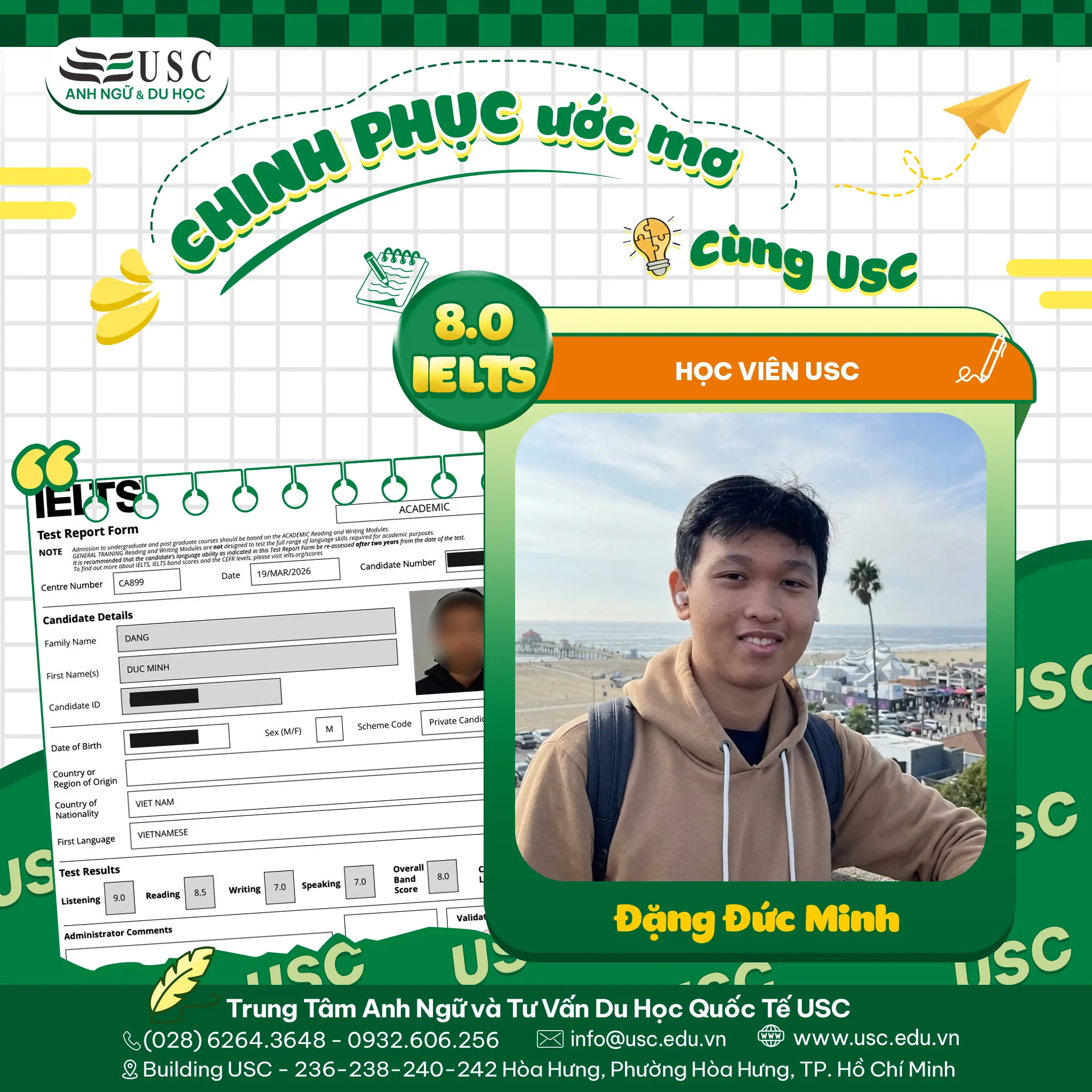 Trung Tâm USC tự hào chúc mừng học viên Đặng Đức Minh đã xuất sắc đạt IELTS 8.0, trong đó kỹ năng Listening đạt điểm tuyệt đối 9.0 – một bước tiến quan trọng trên hành trình chinh phục mục tiêu du học Úc.
