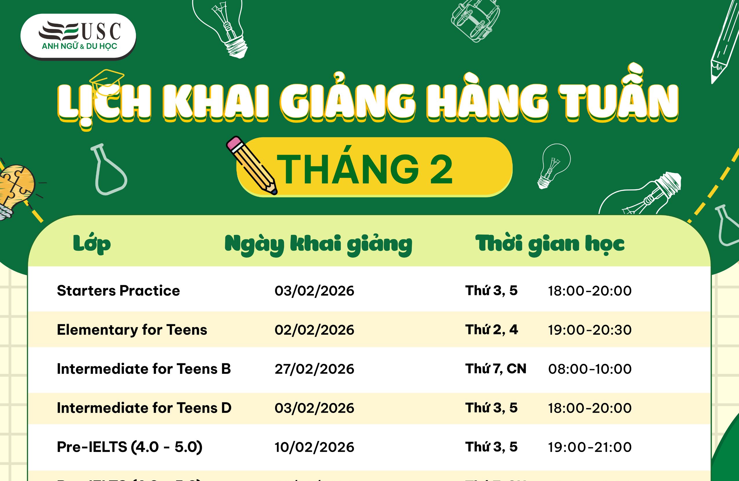 Trung Tâm Anh Ngữ USC thường xuyên khai giảng các khóa học mới với chất lượng cao và uy tín trong công tác giảng dạy. Đảm bảo đáp ứng từng nhu cầu của học viên về khóa học.
